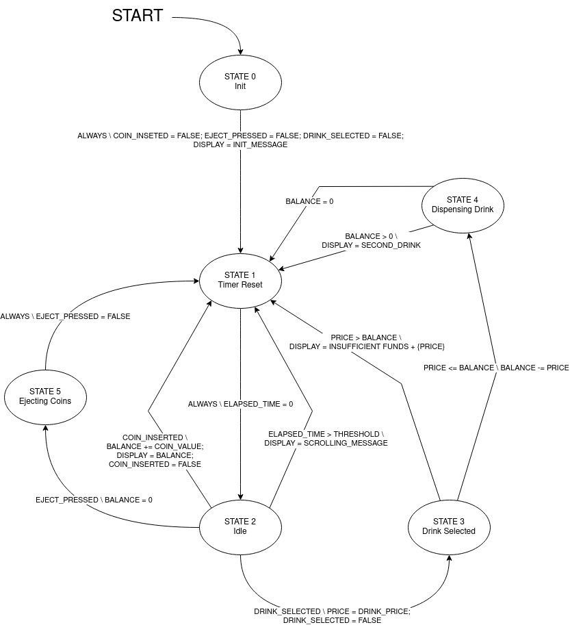Below is a state transition diagram for the Vendotron, developed in Hx0x00.