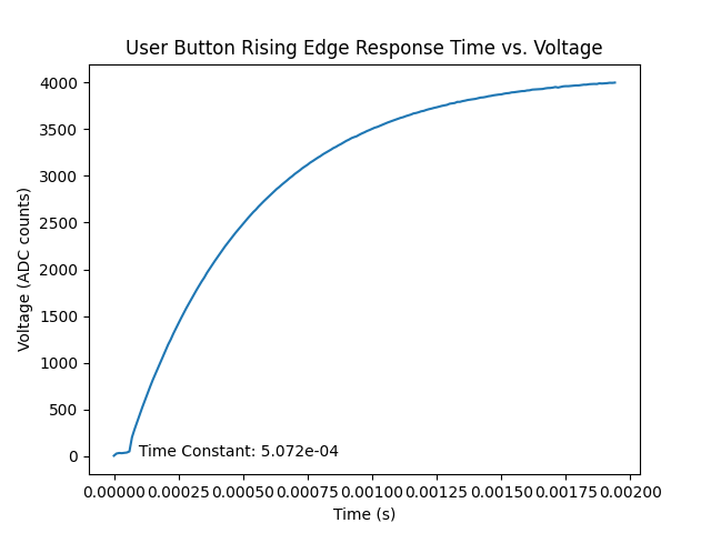 In this lab we characterize the rising edge response of the user button on the Nucleo. The user interfaces with the Nucleo from a frontend terminal which prompts the user to press 'G' to start data collection. The user must then press and release the button and the analog response is recorded and sent back to the frontend. Note that a jumper must be placed between pin C13 and A0 as pin C13 does not have an Analog-to-Digital converter. The response is then analyzed and plotted by the frontend, the time constant reported, and data stored in a .CSV file.
