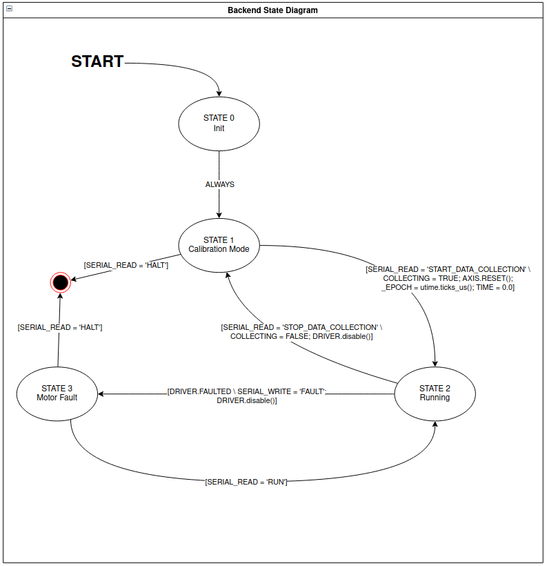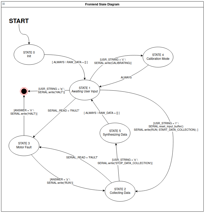 Click Here for an example video illustrating the frontend flow and data collection routine. Below is a state diagram illustrating the control flow for the frontend.