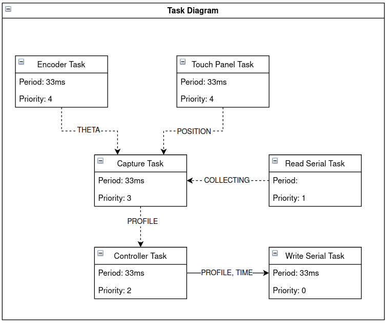 The bulk of the work on this lab was in integrating the sensors and performing UI operations. Although some sample code was provided to aid in task scheduling, I decided to implement my own scheduling scheme for code readability and significant performance gains. After some task analysis, I determined that there are only really two separate tasks that need to be run in parallel: 1) Updating the State and controller then sending data, and 2) Recieving user inputs. Because the first task can be run sufficiently quickly (at 30Hz) velocity measurements and encoder readings stay updated. Additionally, because it is much faster to read both Touch Panel positions at once, both axies have the same time for each reading, weakening any gains from parallelization. Therefore, while velocity calculation and controller updates could be performed asynchronously, they are performed at the same time. Doing so not only has the added benefit of code simplicity, but also helps to reduce parasitic delay. For the first task a linear logic model is then adopted: 1) Capture the state by reading Touch Panel positons, Encoder positions, then calculating velocities for both axies. 2) Update each axis' controller with the newly captured state 3) Write a data point to the serial line consisting of: